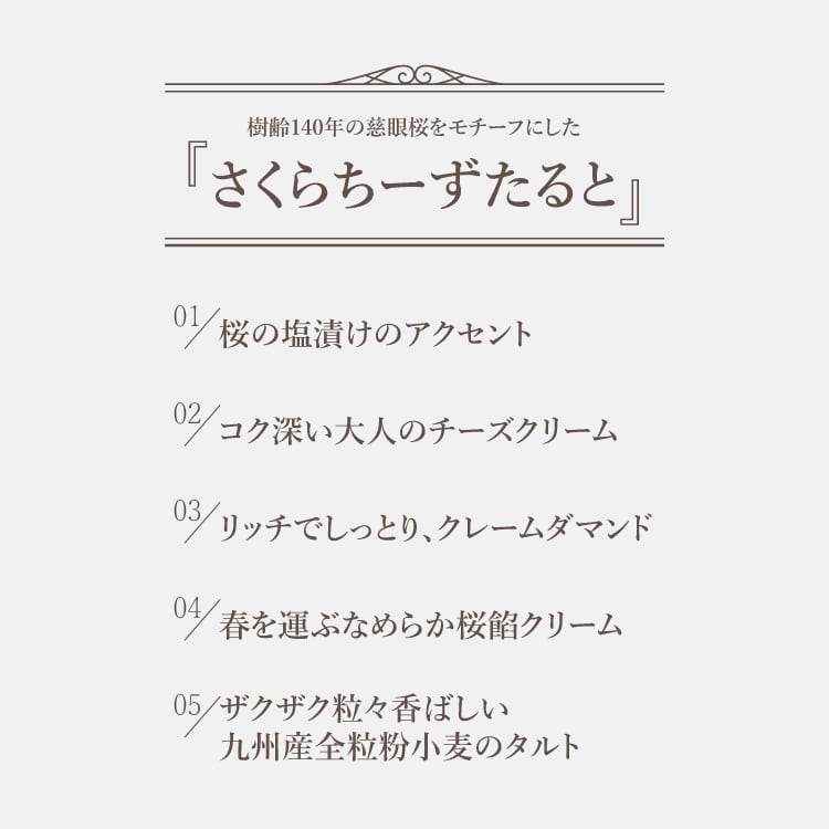 ザクザクのタルトは九州は長崎平戸島育ちの希少な全粒粉小麦を配合。小麦のおいしさが際立ちます。しっとりアーモンド生地に、コクのある濃厚なチーズクリーム。なめらかでまったりとしたさくら餡クリームとを重ね、淡い桜色とのコントラストも優しい華やかさです。