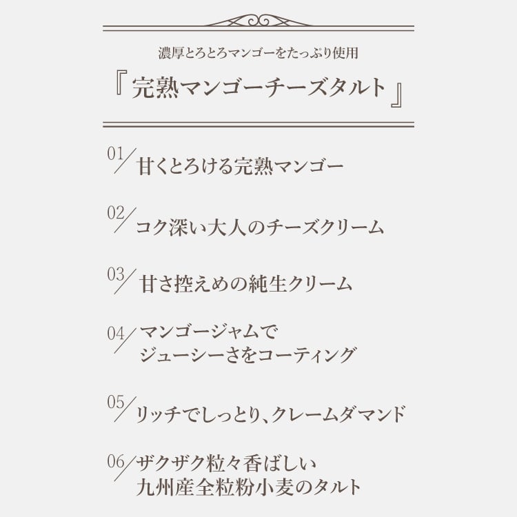 なめらかチーズムースクリームと、しっとりアーモンドダマンド。贅沢にたっぷりデコレーションした完熟マンゴーのあまいあまい、ジューシーなおいしさを、さらにマンゴーピューレで閉じ込めました。