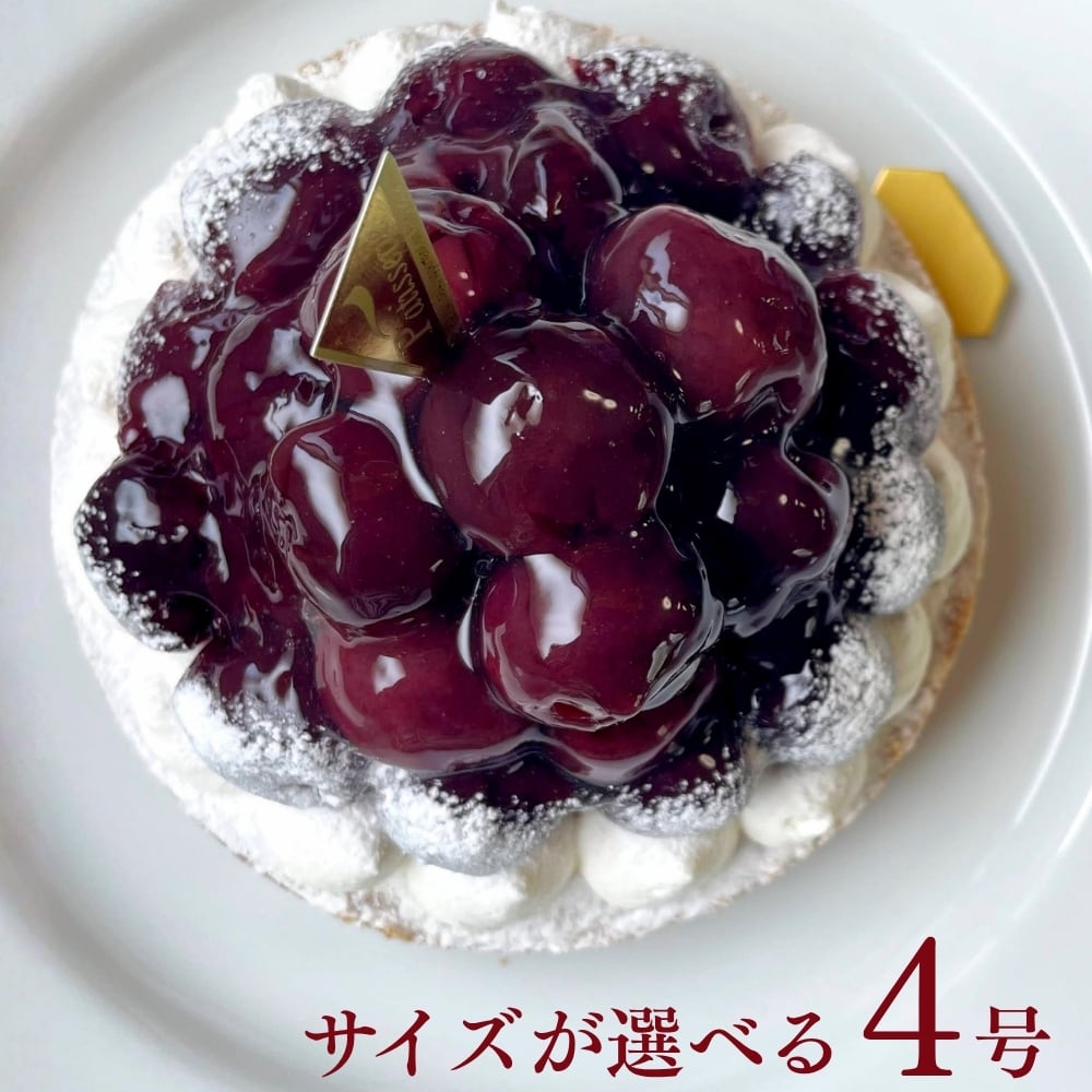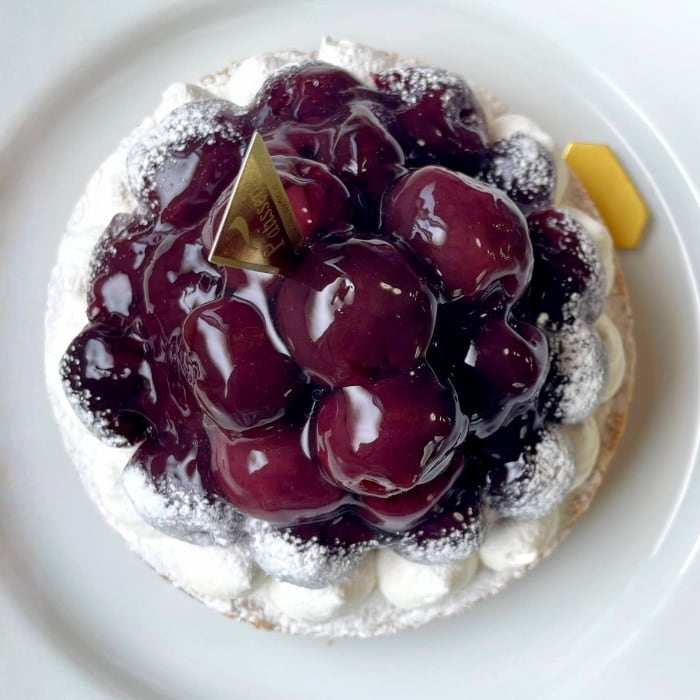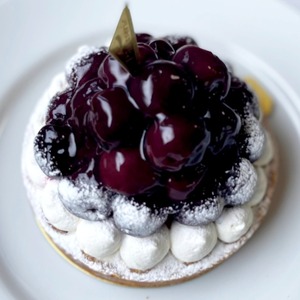 大粒のジューシーなダークチェリーをたっぷりデコレーションした紫壇色に艶めくタルトは、ギフトにも差がつくスイーツです。