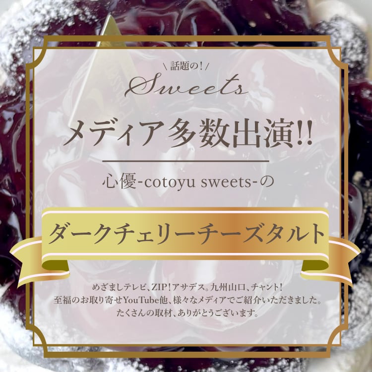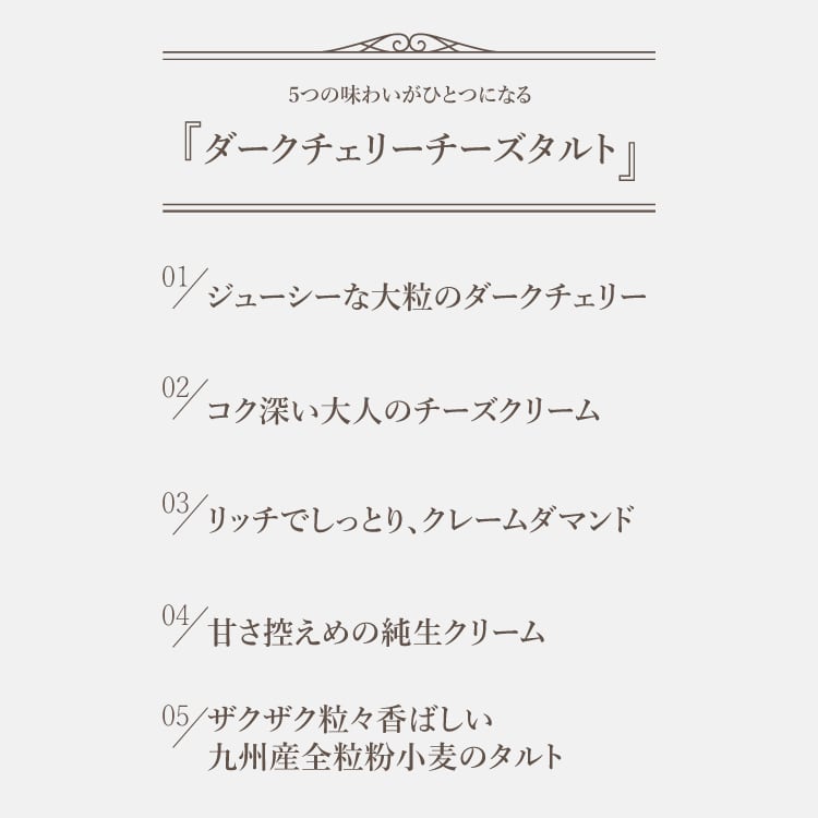 平戸産の粗挽き全粒粉小麦をタルト生地に配合し、小麦の旨みと香ばしさを引き出して、ザクッと焼き上げました。チーズムースクリームとジューシーな大粒ダークチェリーの酸味とコクのマリアージュをお楽しみください。
