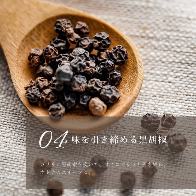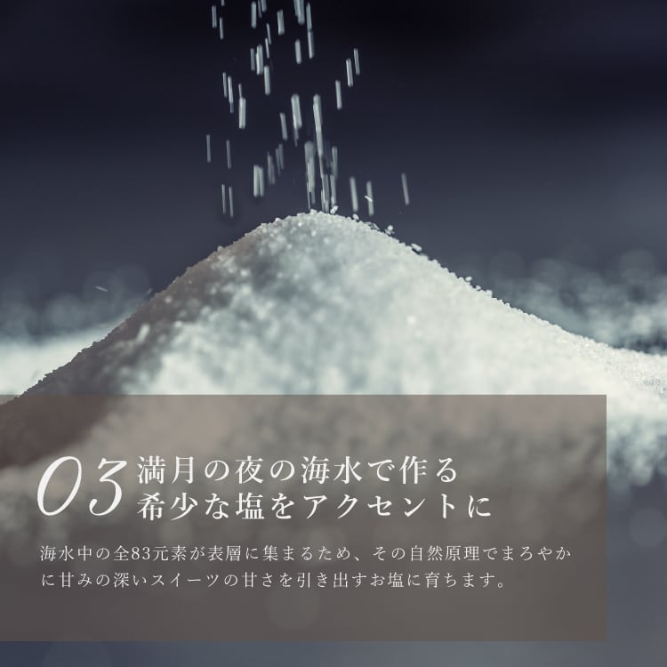 平戸産の粗挽き全粒粉小麦をタルト生地に配合し小麦の旨みと香ばしさを引き出して、ザクッと焼き上げました。しっとりアーモンドダマンドに、新鮮ミルクを炊き上げたキャラメルソースをとろりと絡めた、アーモンド、カシューナッツ、パンプキンシード、くるみの4種のナッツの美味しさが広がります。