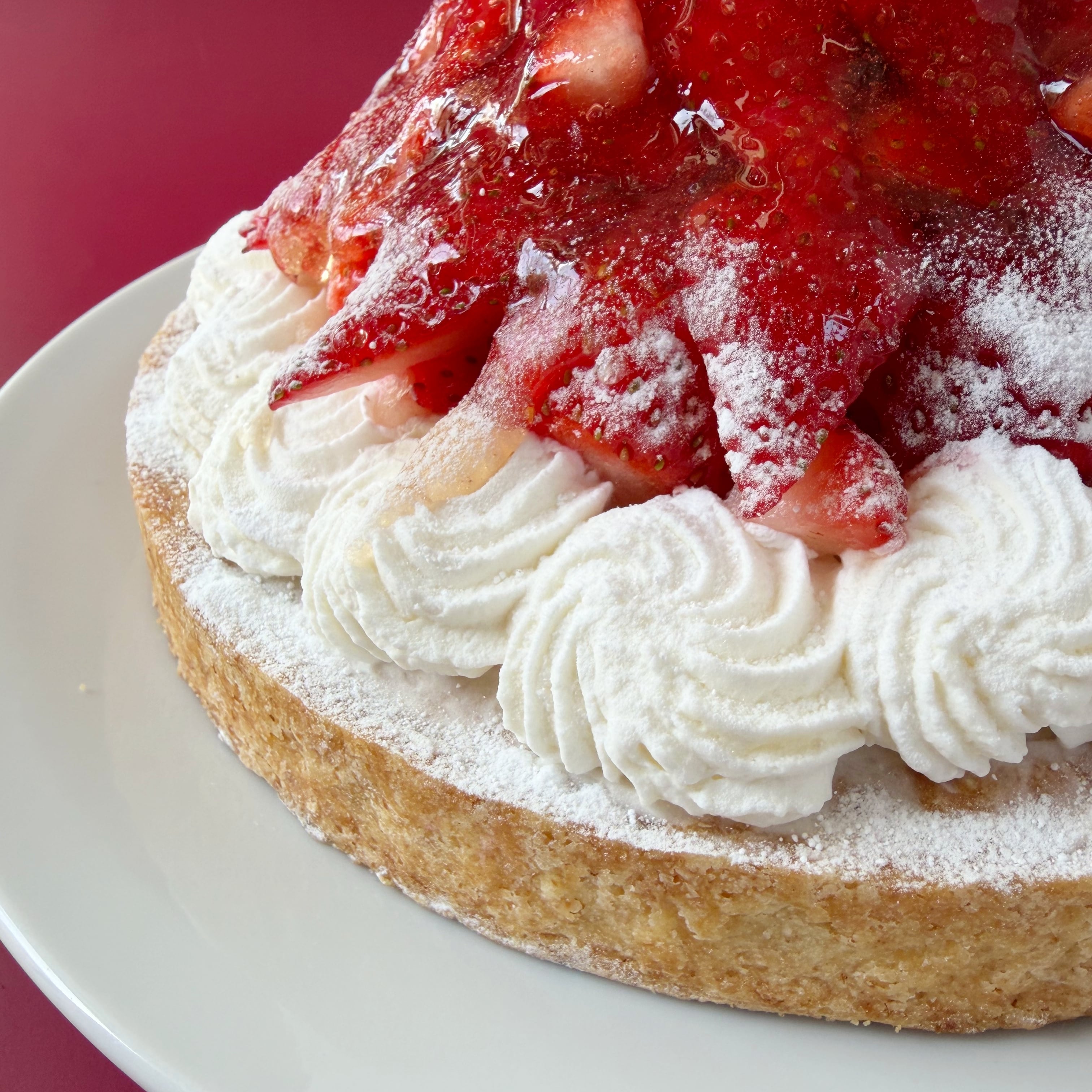 しっとりアーモンド生地の上には、完熟のつみたて新鮮いちごをコンフィチュールに炊き上げ、チーズムースクリームと合わせたストロベリーチーズクリームをたっぷり乗せました。