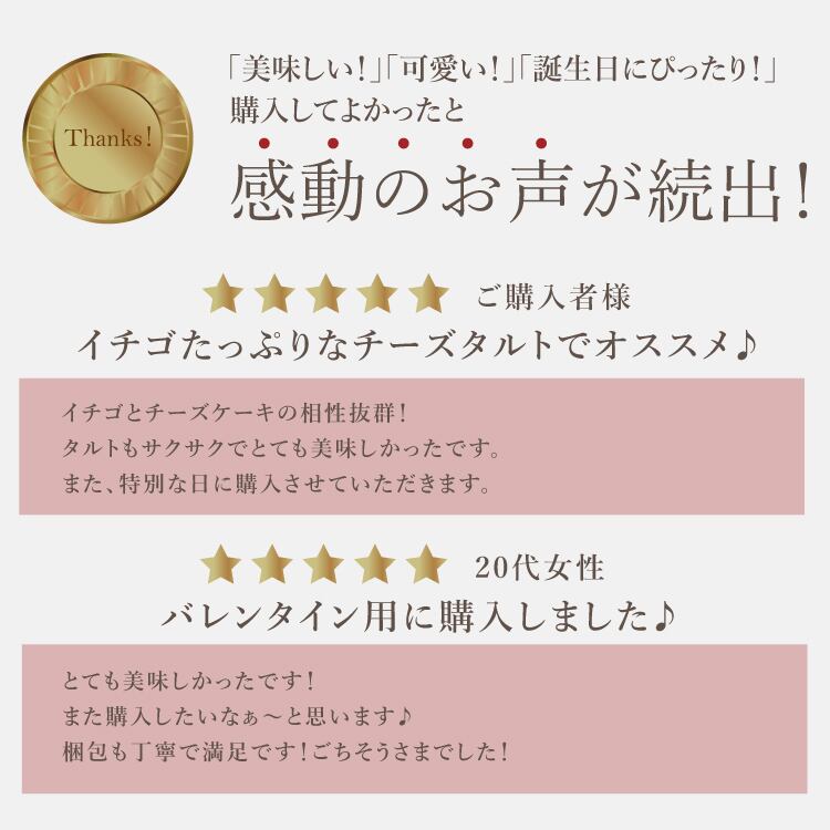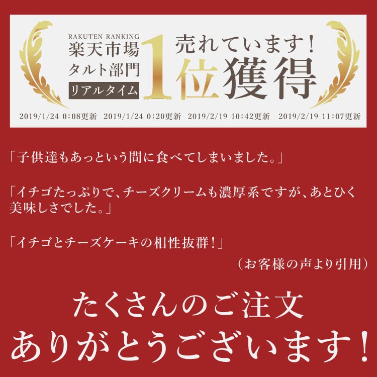 母の誕生日に購入しました。予定通り商品も到着しましたし、いちごタルト大好きな母は大変喜んでおりました。味も美味しかったそうです