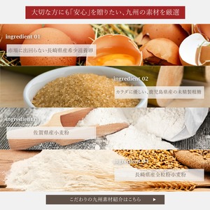 長崎県産の希少卵、佐賀県産小麦、鹿児島県産粗糖と、厳選素材だけで作る、カラダに優しい、ギフトにもぴったりの大人のご褒美スイーツです。