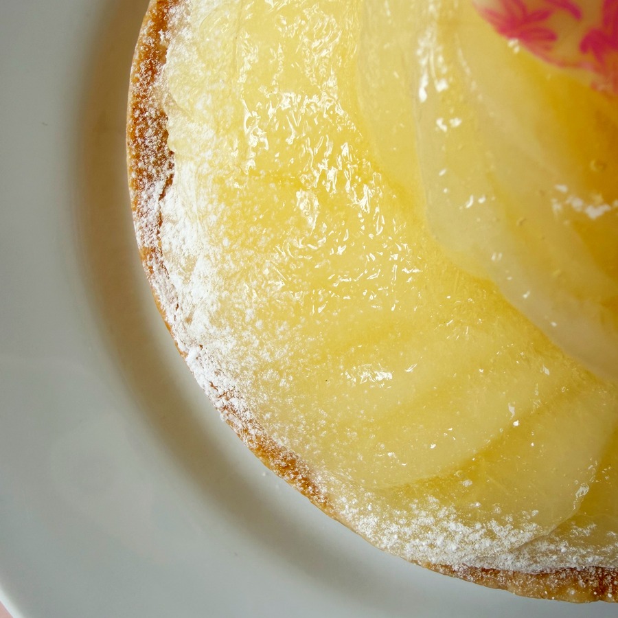 平戸産の粗挽き全粒粉小麦をタルト生地に配合し、小麦の旨みと香ばしさを引き出して、ザクッと焼き上げました。しっとりアーモンド生地に、チーズムースクリームとジューシーなラフランスをたっぷりデコレーション。