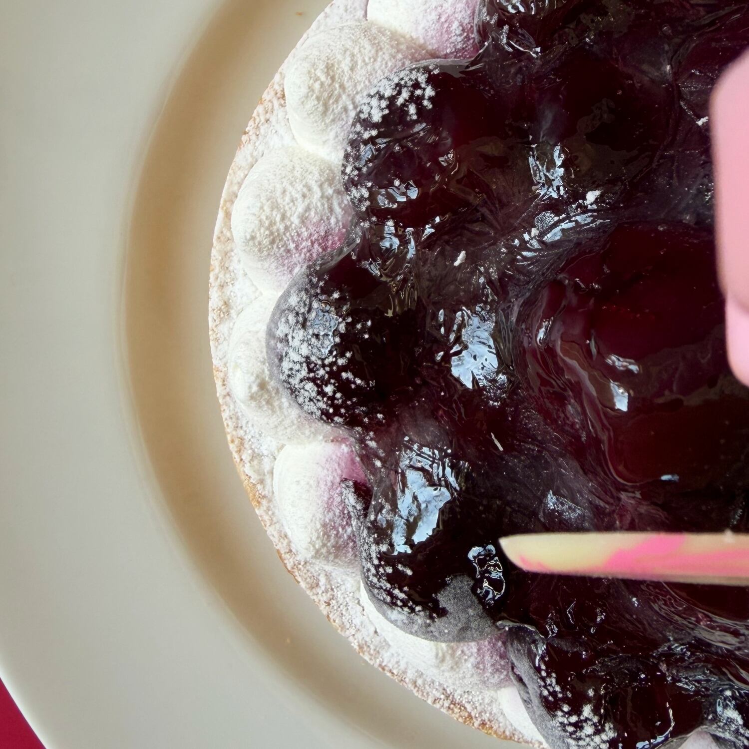 大粒のジューシーなダークチェリーをたっぷりデコレーションした紫壇色に艶めくタルトは、ギフトにも差がつくスイーツです。