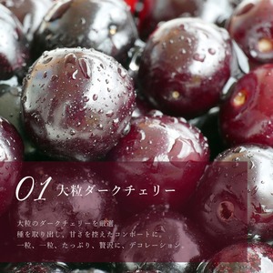 原材料名 ダークチェリー(チリ共和国産)、生クリーム、クリームチーズ、粗糖、小麦粉、バター、卵、アーモンドプードル、全粒粉小麦粉、ナパージュ(水飴、砂糖)、粉糖、添加物、安定剤(ペクチン)、ゼラチン、酸味料、香料 (一部に乳成分、卵、小麦を含む)