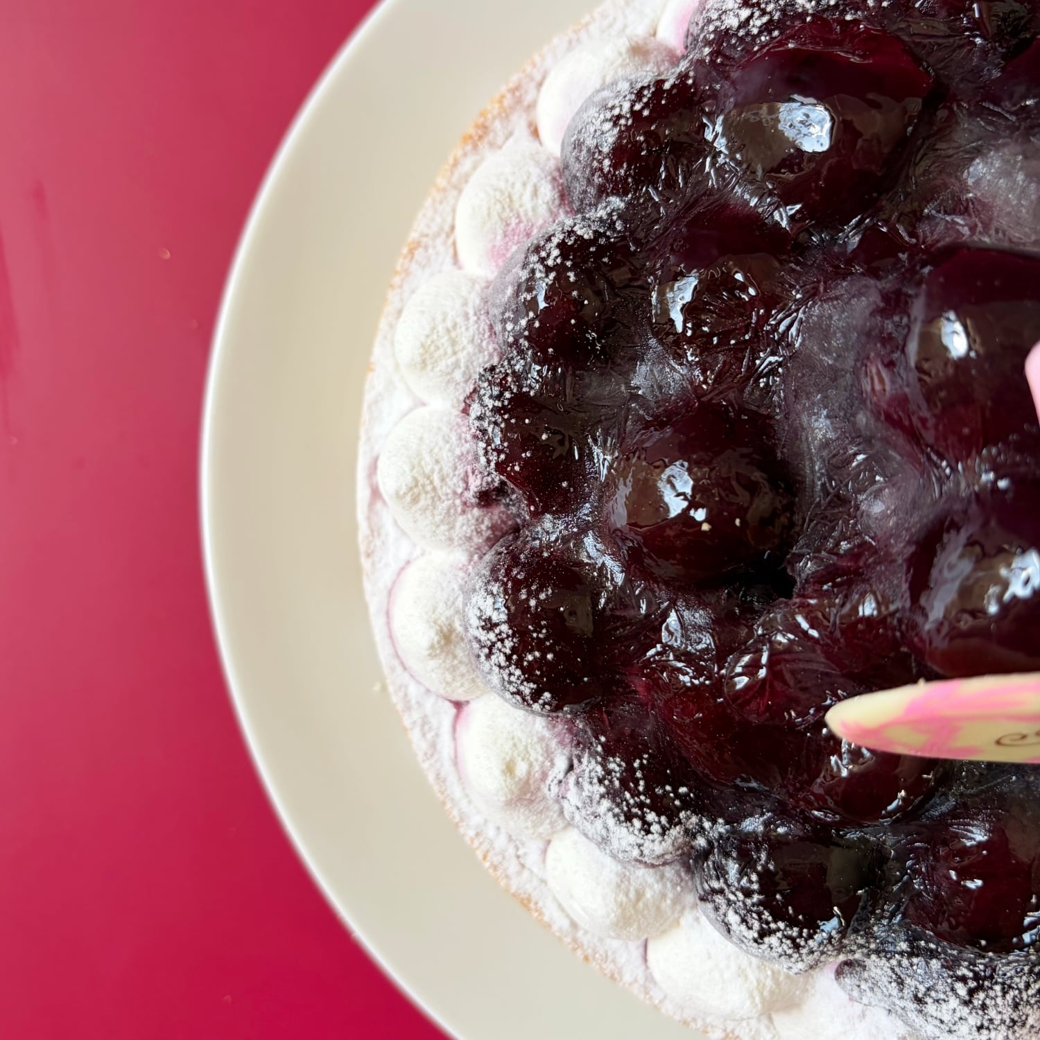 大粒のジューシーなダークチェリーをたっぷりデコレーションした紫壇色に艶めくタルトは、ギフトにも差がつくスイーツです。