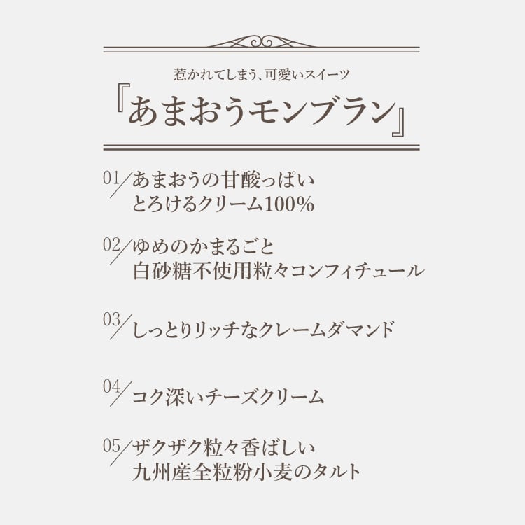 ザクザクのタルトは九州は長崎平戸島育ちの希少な全粒粉小麦を配合。小麦のおいしさが際立ちます。しっとりアーモンド生地の上には、コクあるチーズムースクリーム。完熟のつみたてのゆめのかをコンフィチュールに炊き上げ、たっぷり乗せました。