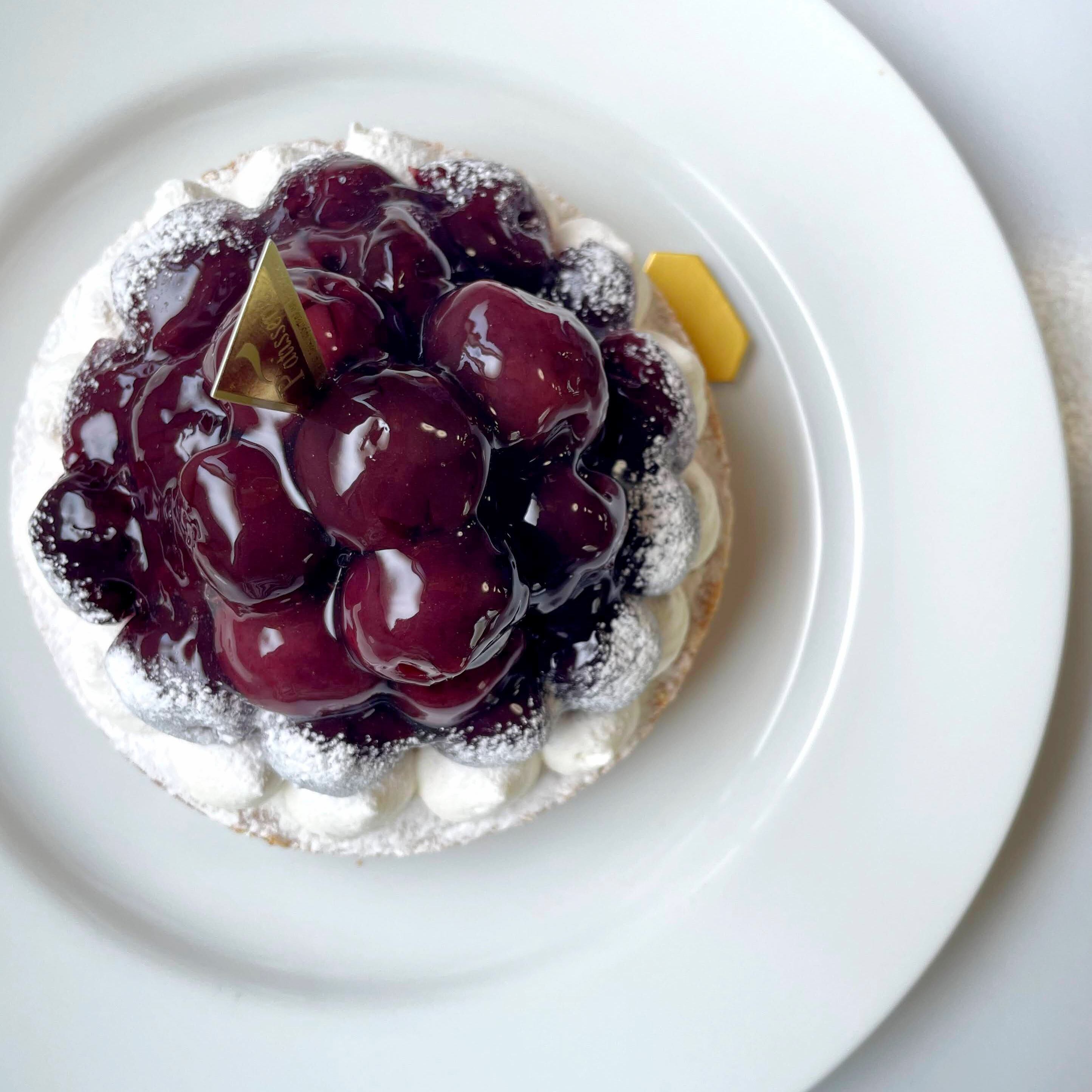 大粒のジューシーなダークチェリーをたっぷりデコレーションした紫壇色に艶めくタルトは、ギフトにも差がつくスイーツです。